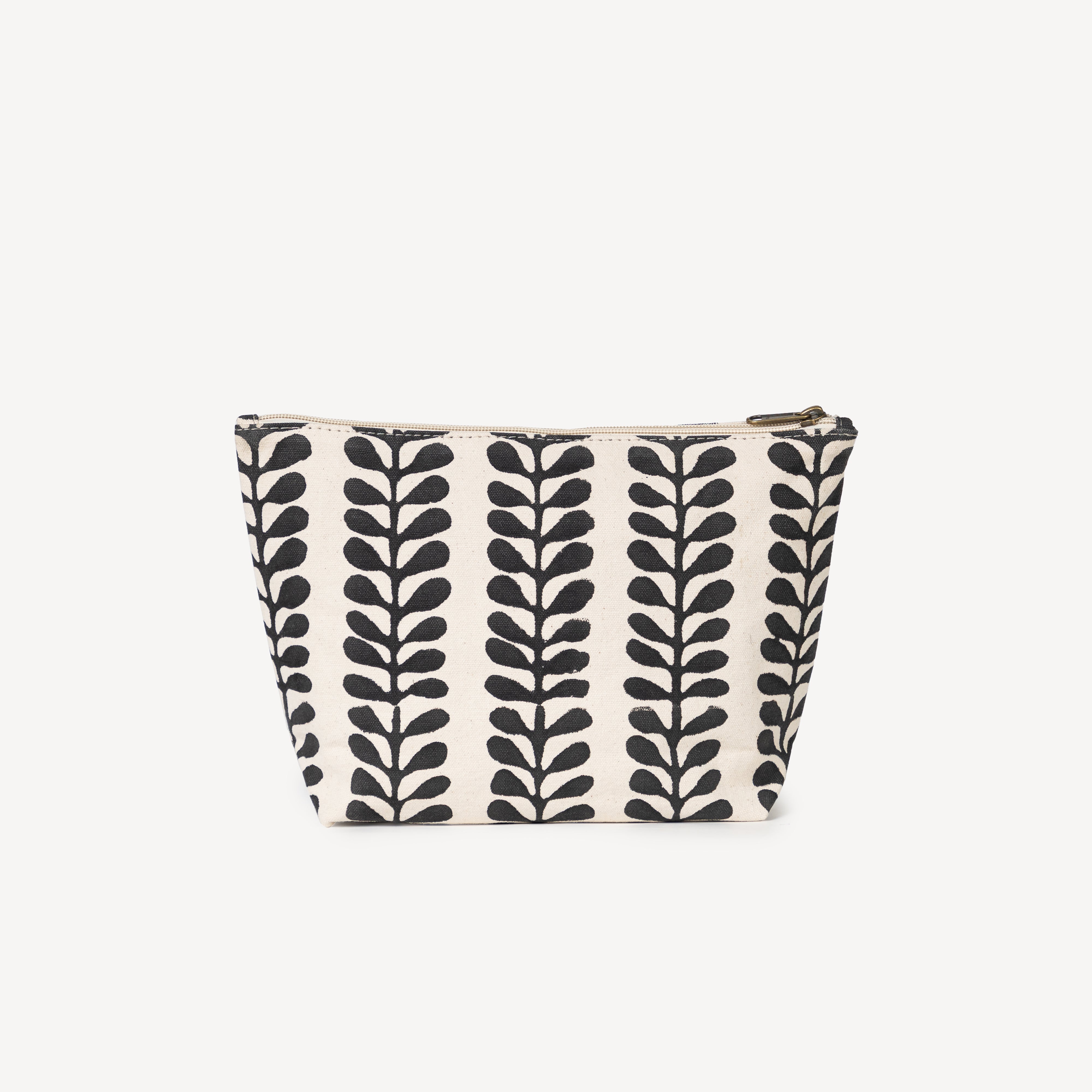 Hand block printed canvas with a waterproof interior, our large pouch works perfectly for both  weekends away or the daily commute. In a generous size that carries everything from your skincare to your charging cables while tucking neatly inside our larger totes.